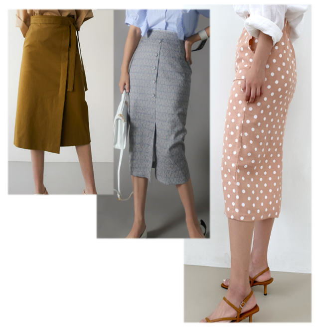 여성적인 실루엣의 스커트디자인이 많으며 자칫 종아리가 굵어 보일수가있으니