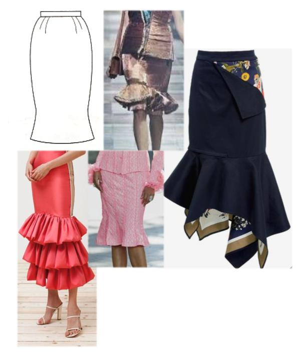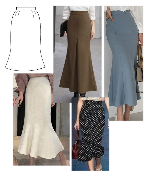 허리에서 힙라인 허벅지라인은 꼭맞게 하고 그 아래로 플레어나 게더등으로 밑단을 넓게 표현합니다.
