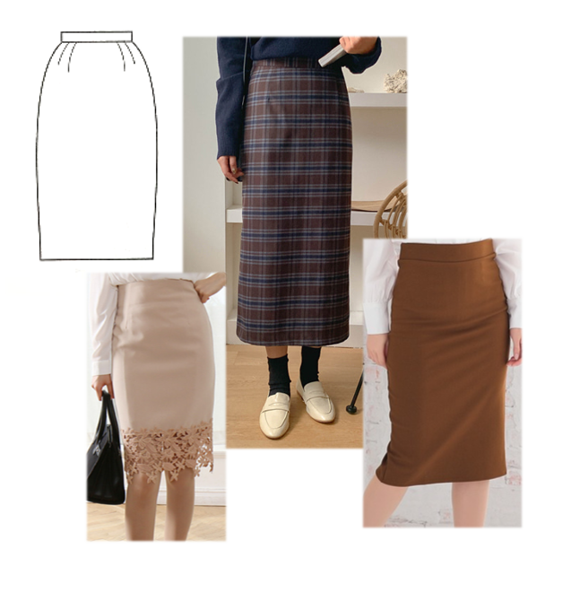 시스 스커트(sheath skirt), 펜슬 스커트(pencil skirt), 내로우 스커트(narrow skirt)가 여기에 해당이 됩니다.