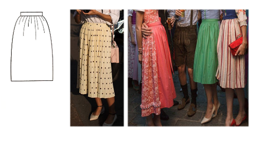 던들 (Dirndl) 실루엣은 허리라인에 개더를 많이 주어서 복부 힙이 볼록하게 표현되는 실루엣을 말합니다.